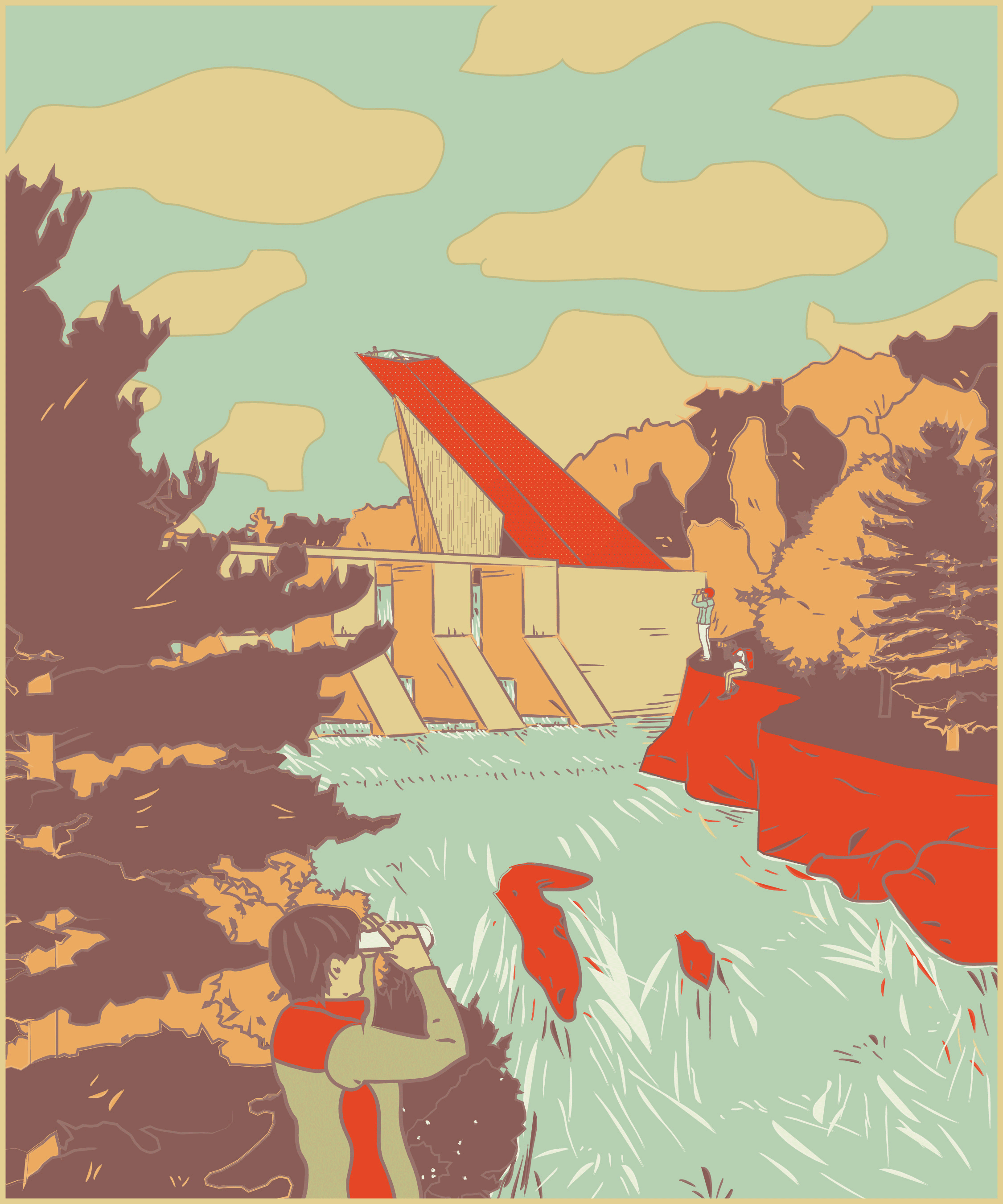 “Approaching from the water, in a small canoe the water just ends. The sounds of a rushed deluge can be heard over the voices of picnickers and swimmers who are careful not to get too close to the water’s edge. Looming over it all is a stoic monument reminiscent of the great white pines harvested so long ago. It a different atmosphere than what you are used too: High Falls Dam has always been a fun little excursion where you might see some fish hopping over the surf. Now it is so much more. From atop the tower the whole expanse can be seen. The beginning and end of Baptiste Lake. A place where the past is not forgotten or washed away.”